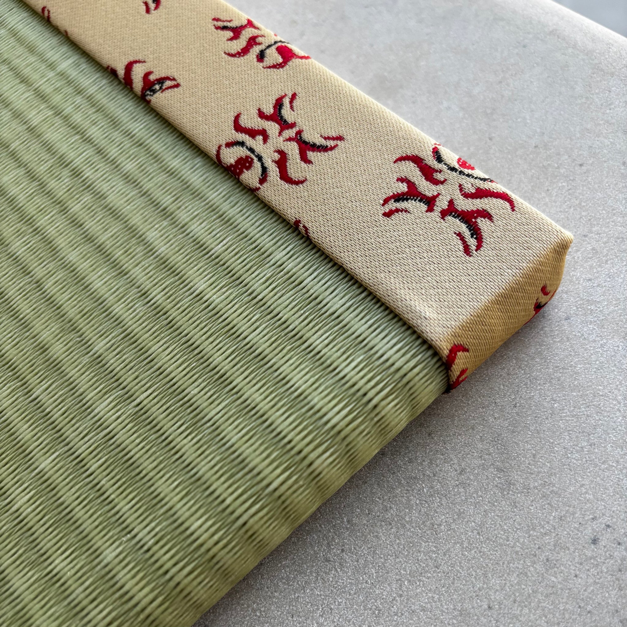 This tatami features a trim made with “Nishijin Kinran (西陣金襴)” fabric from Kyoto. It traditionally adorns Japanese items such as kimono, ceremonial robes, hina dolls, and tea ceremony tools.